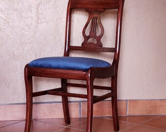 Antique vintage children's size wooden harp back dining chair retro woven fabric.